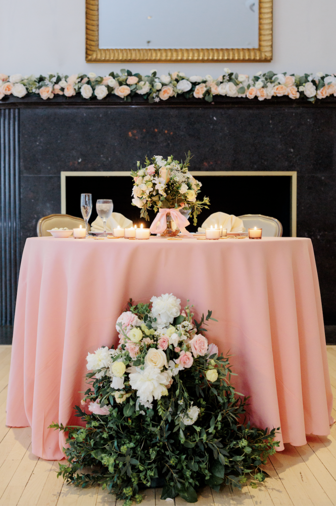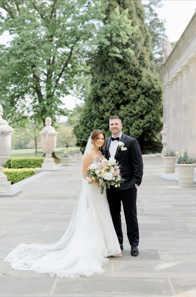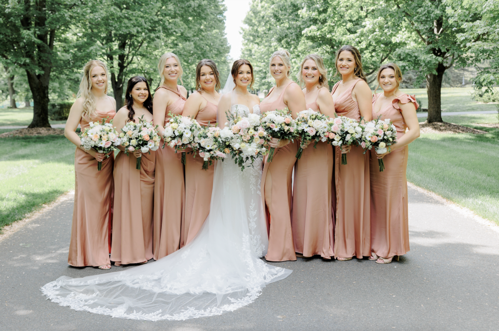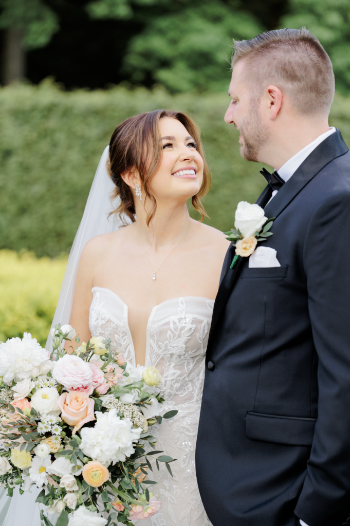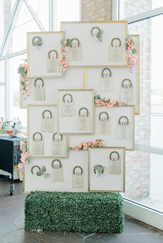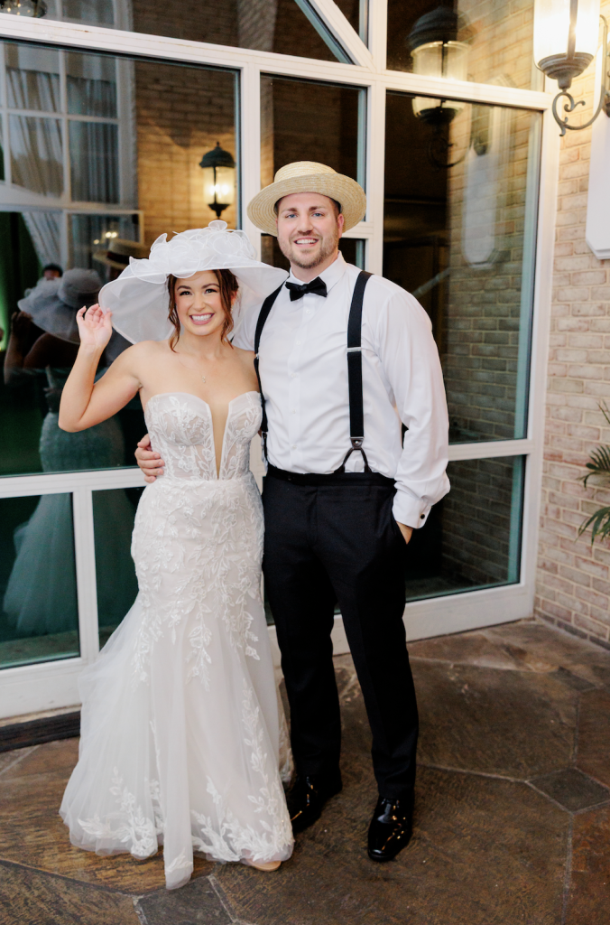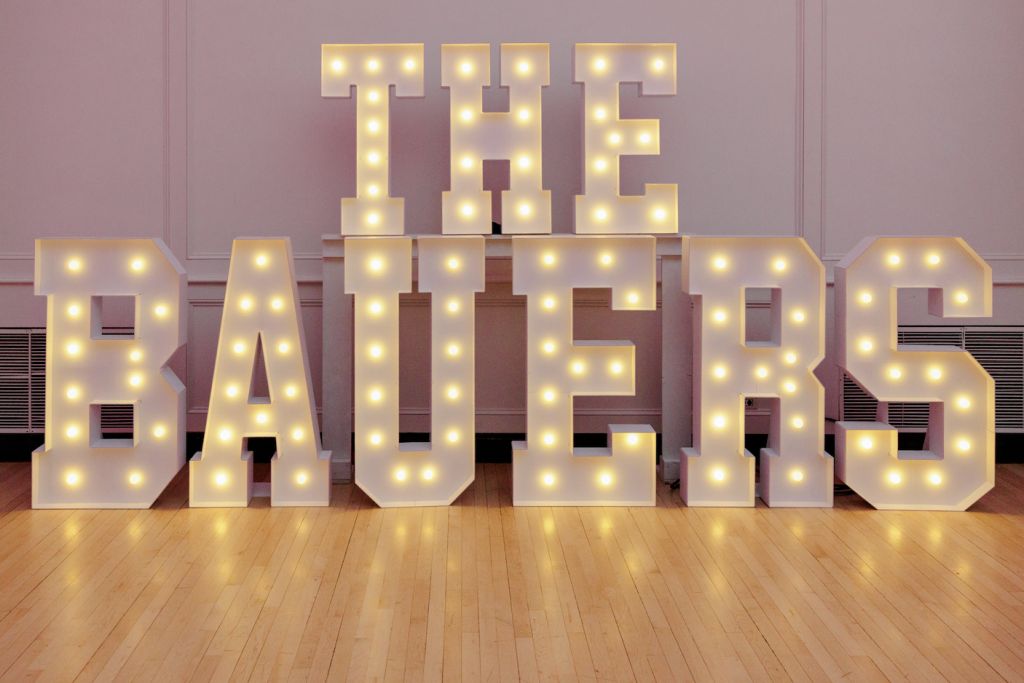 Their day was filled with personal touches that made the celebration uniquely theirs. In true Derby-loving fashion, they projected the Kentucky Derby during the reception so guests could cheer right alongside them—even on their wedding day, they weren’t missing the race. Soft blush, ivory and muted greenery set the tone for their romantic color palette, carried through the lush florals featuring delicate ranunculus, full garden roses, peonies, and airy textures throughout the arrangements. Their seating display incorporated vintage-style horseshoes as a nod to the Derby theme, while oversized marquee letters spelling THE BAUERS added a fun, modern statement to the reception space. Topping it all off was their adorable cake topper, a small but sweet detail that perfectly captured their personality and brought together the charm and playfulness of the day.