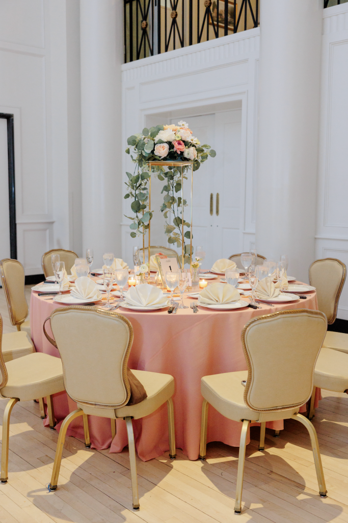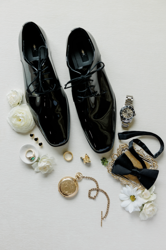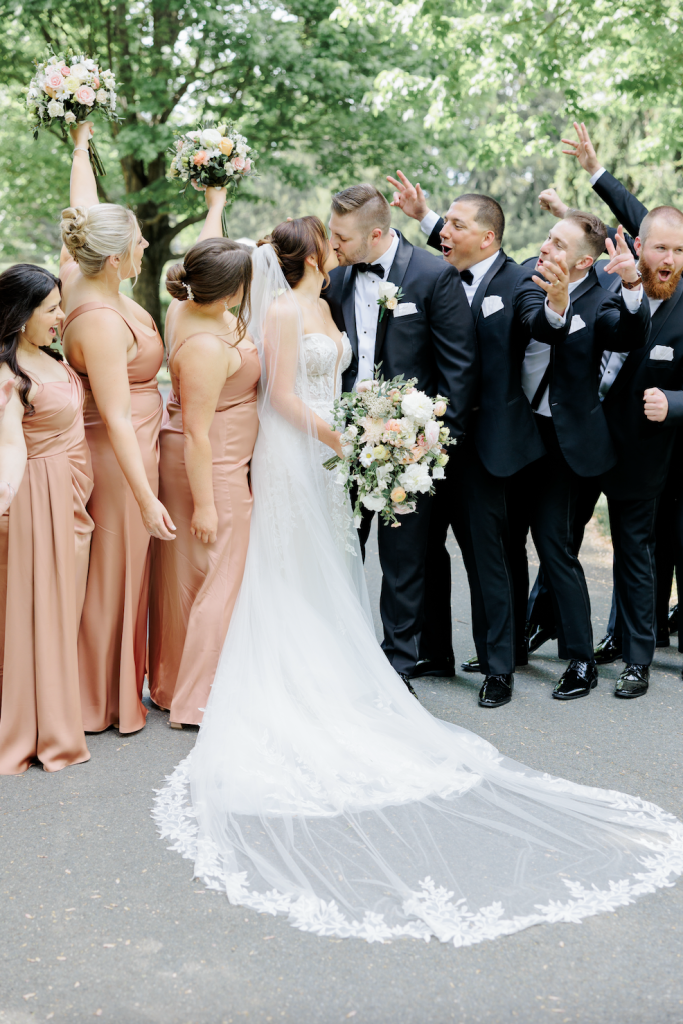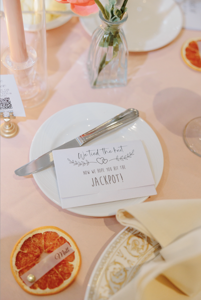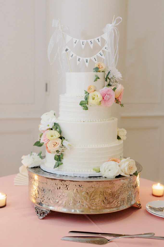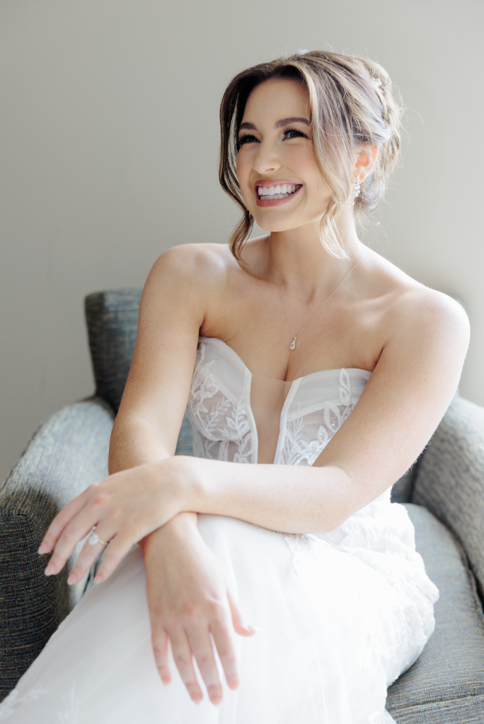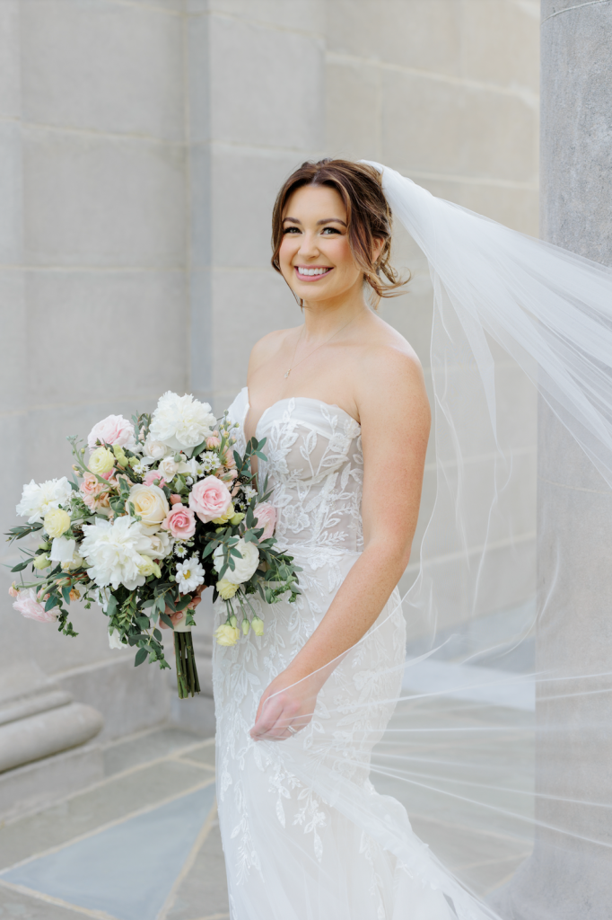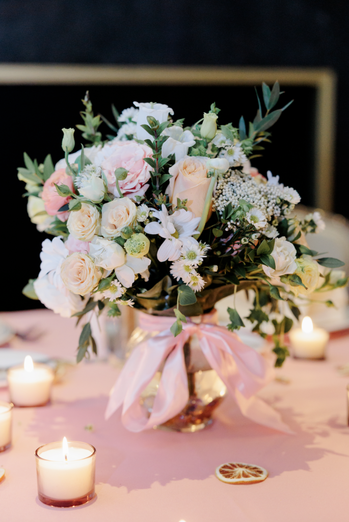 Their day was filled with personal touches that made the celebration uniquely theirs. In true Derby-loving fashion, they projected the Kentucky Derby during the reception so guests could cheer right alongside them—even on their wedding day, they weren’t missing the race. Soft blush, ivory and muted greenery set the tone for their romantic color palette, carried through the lush florals featuring delicate ranunculus, full garden roses, peonies, and airy textures throughout the arrangements. Their seating display incorporated vintage-style horseshoes as a nod to the Derby theme, while oversized marquee letters spelling THE BAUERS added a fun, modern statement to the reception space. Topping it all off was their adorable cake topper, a small but sweet detail that perfectly captured their personality and brought together the charm and playfulness of the day.
