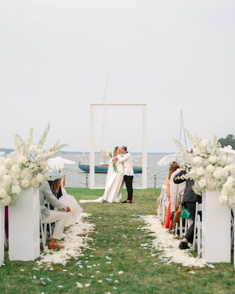 Every detail of Courtney + Michael’s coastal celebration was effortlessly timeless — from their romantic waterfront ceremony adorned with lush white blooms by J. Starr’s, to their dreamy just-married portraits captured aboard the boat.