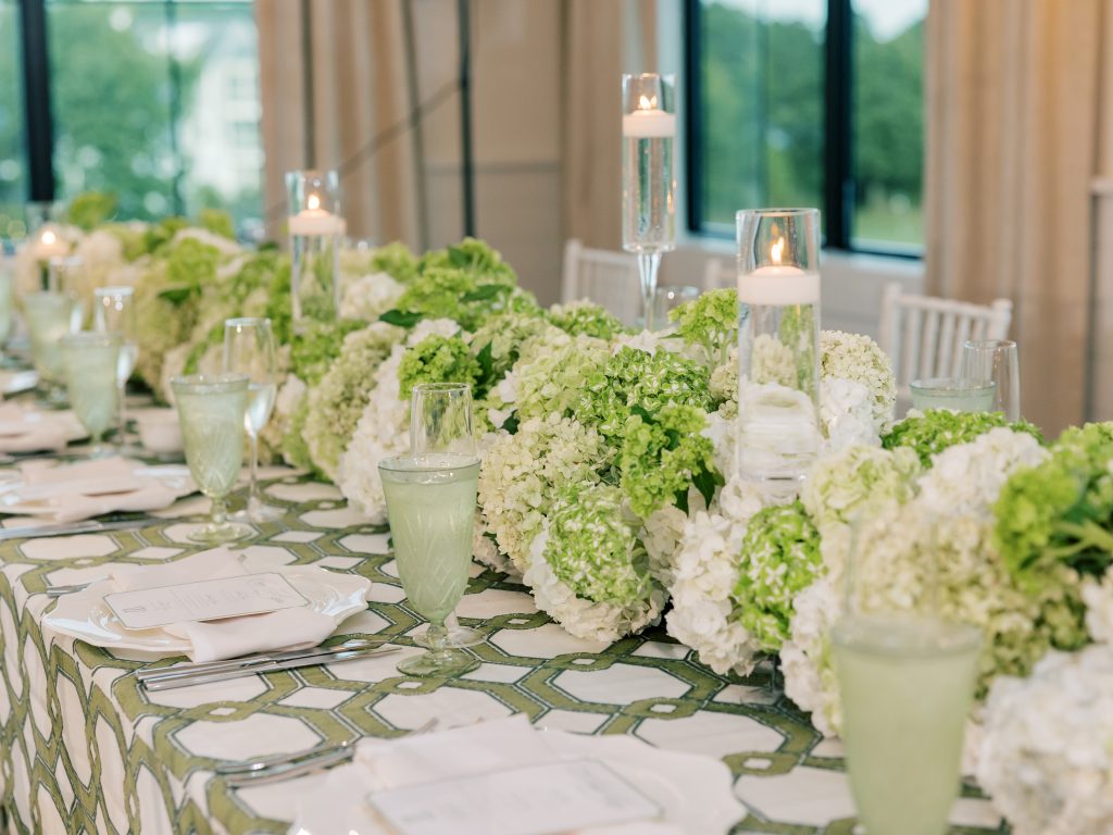 Long, continuous arrangements ran the length of the tables, full and lush, spilling slightly over the edges. The kind of centerpiece that doesn’t rely on height to make an impact because it takes over the entire table.