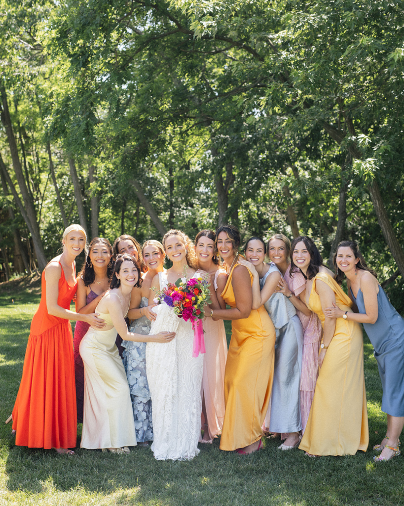 Corals, golds, pinks, and blue layered in across the bridal party, some in solids, others in print. It shouldn’t work on paper, but it does. The color is a statement we love to see.