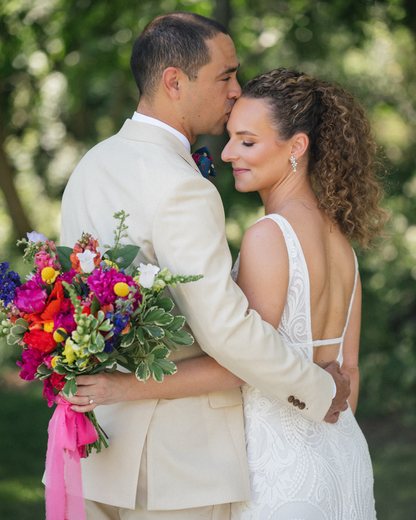 Bride and groom share intimate moment under blooming spring trees holding colorful bouquet