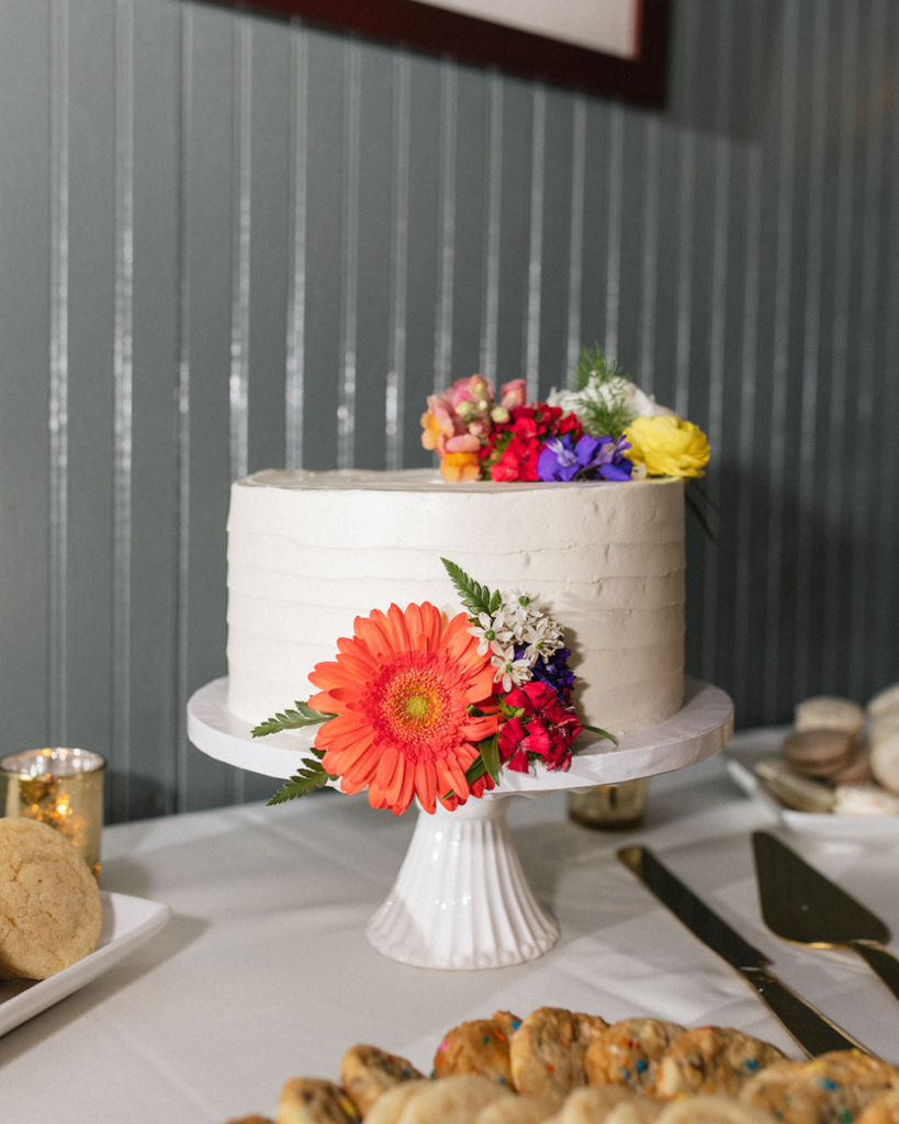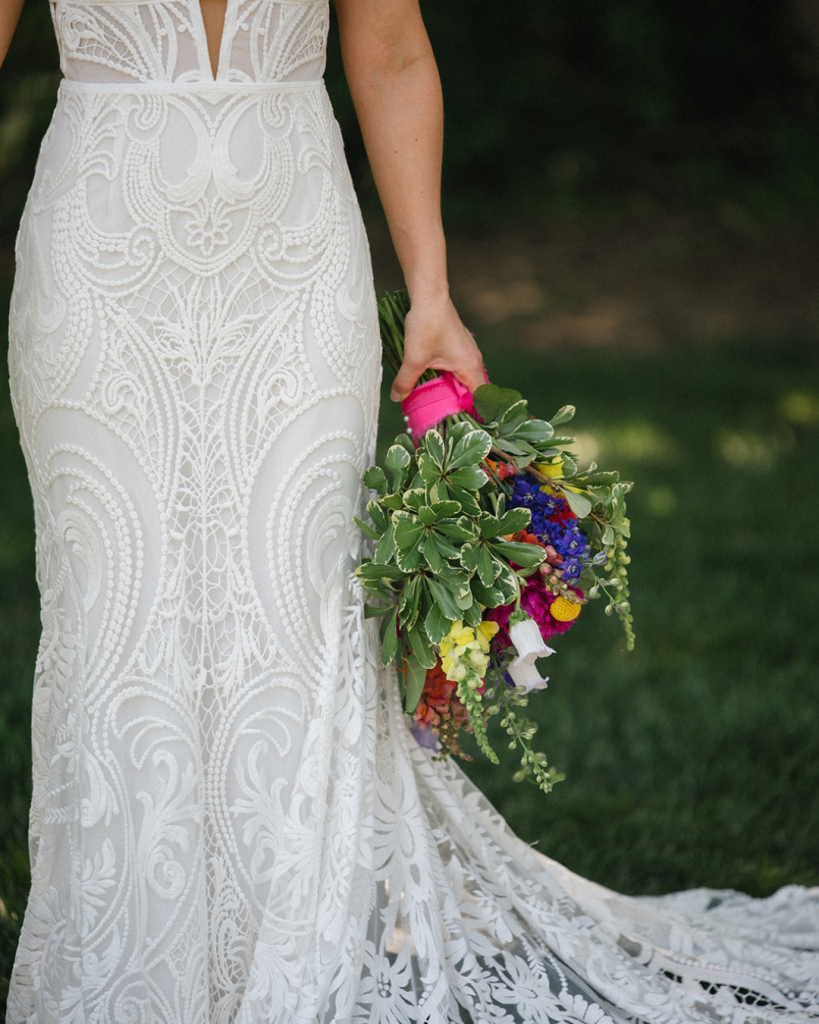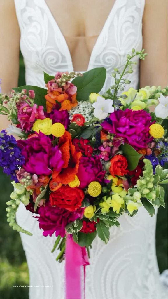 Bright, saturated blooms by Wildly Native Flower Farm that don’t fade into the background. They hold their color against the water and the dress, and still stand out.