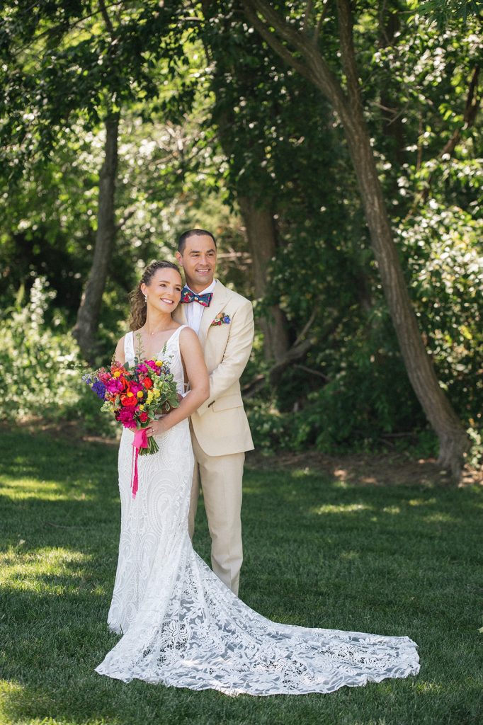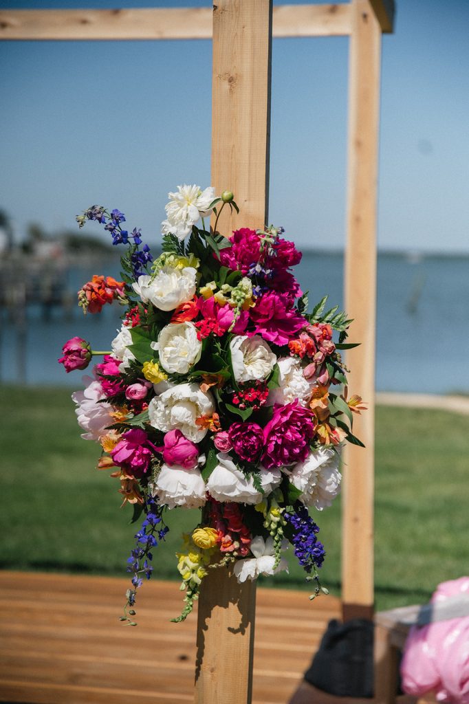 Bride with bridesmaids in colorful dresses holding vibrant bouquets at Eastern Shore waterfront wedding