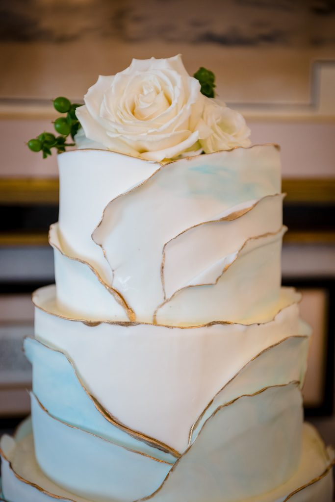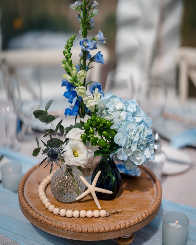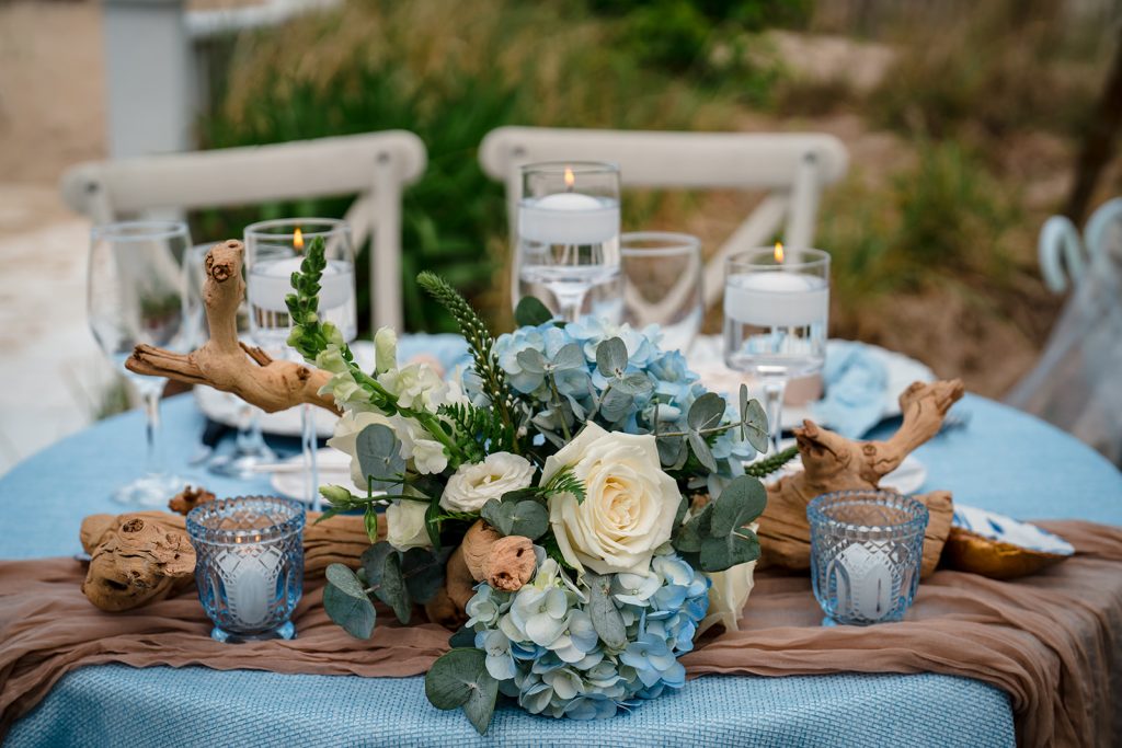 Soft blue linens. Driftwood and coastal touches worked into elegant tablescapes. A cake design echoing the color and movement of the waves. Their sweetheart table set against the dunes.