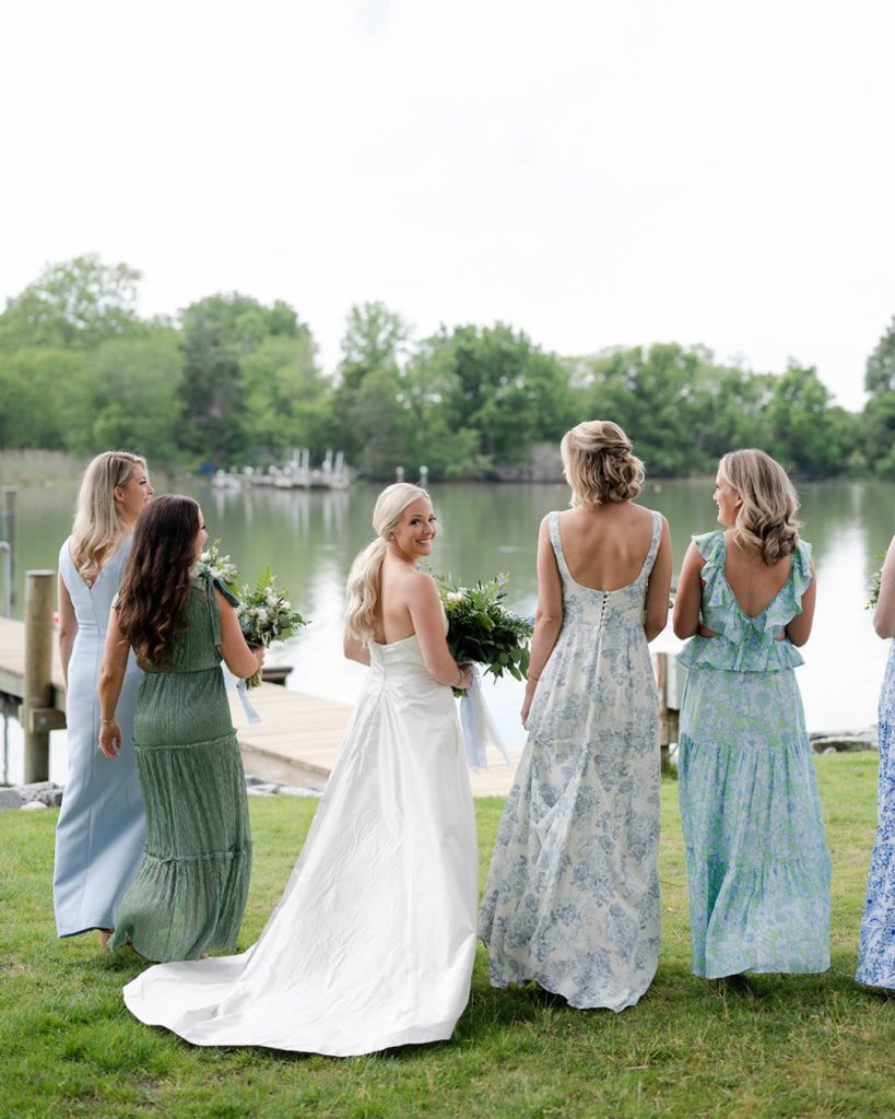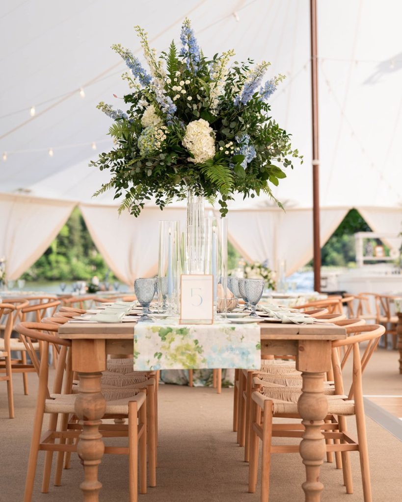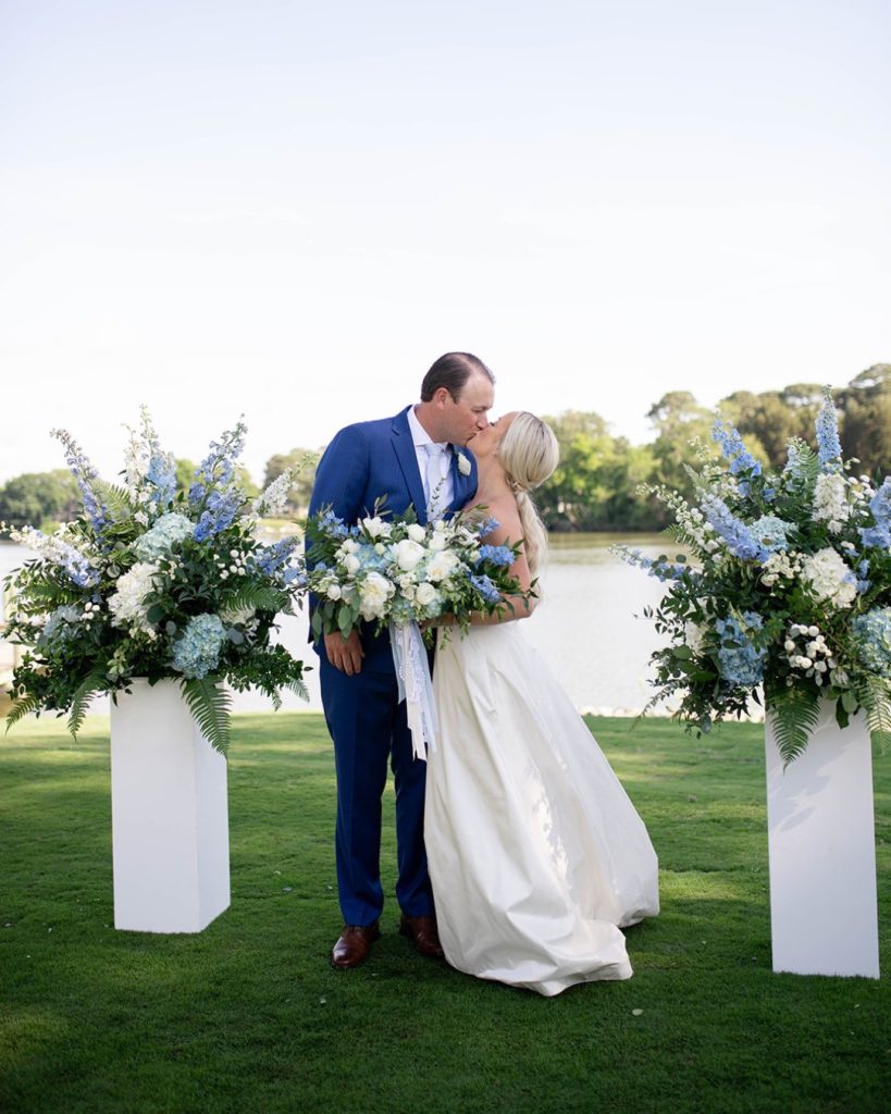 Set along the Choptank River, their ceremony embraced the natural landscape rather than competing with it. Lush blue and white florals framed the vows, echoing the tones of sky and water while adding softness and movement to the riverside setting. Designed by J. Starr’s Flower Barn, the arrangements layered hydrangea, delphinium, and textured greenery in a way that felt abundant yet refined.