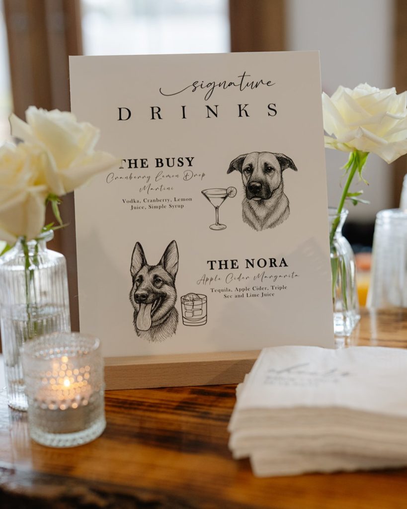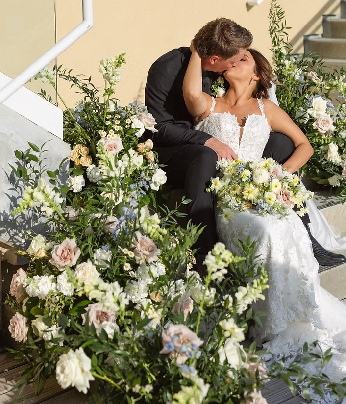 Florals by Veronica Blooms stayed within a restrained palette, reinforcing the black and white design without competing with it.