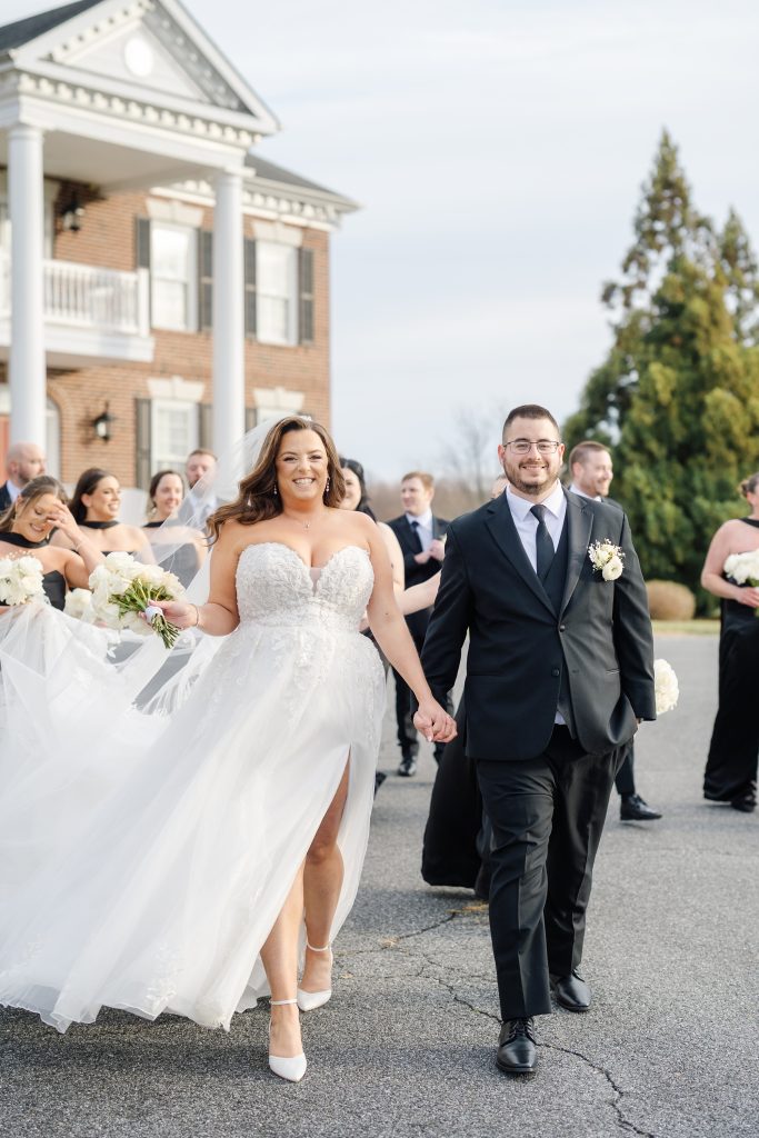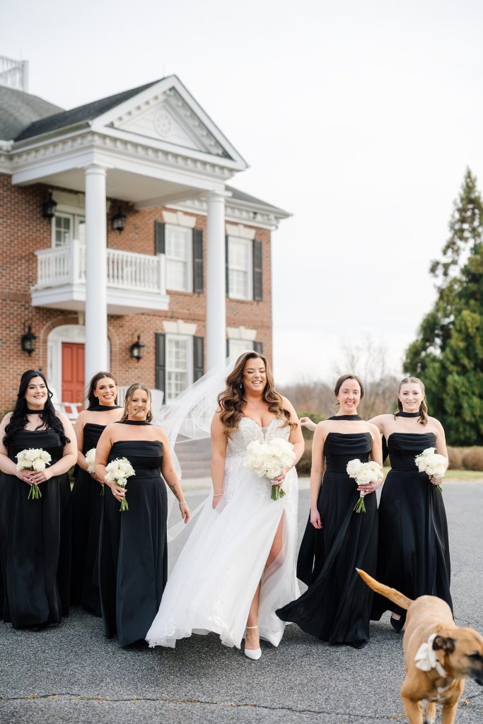 Bride with bridesmaids in black dresses holding white bouquets at King Cole Farm wedding in Dover Delaware