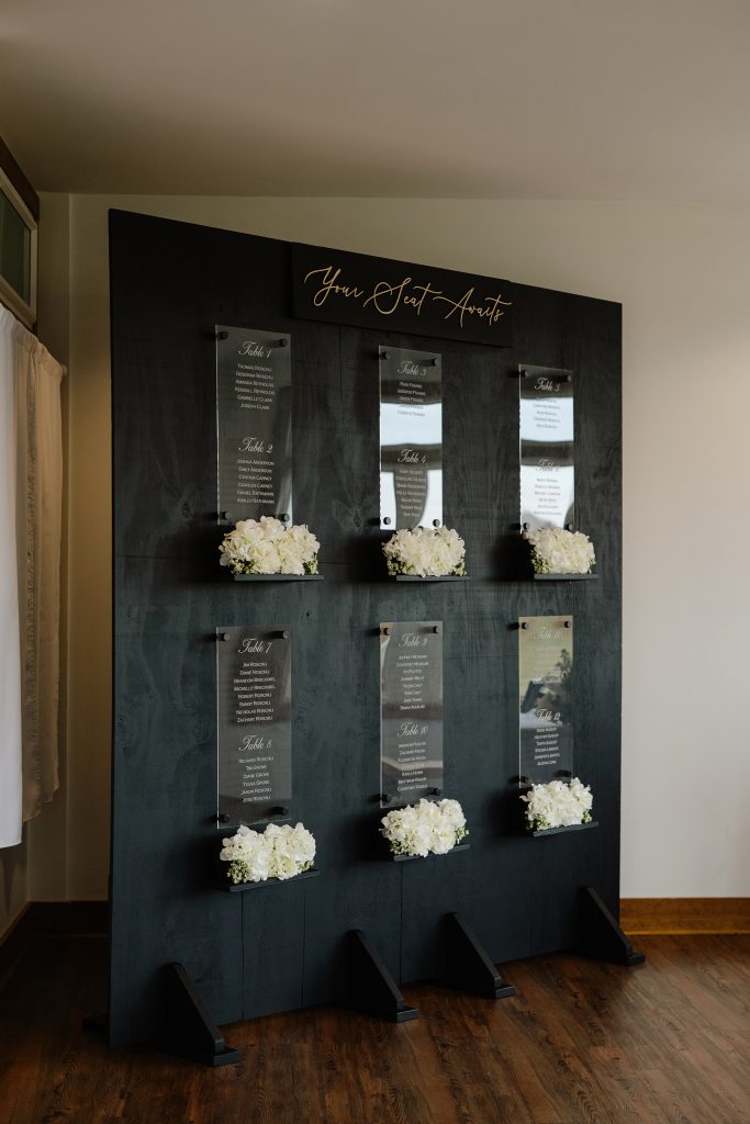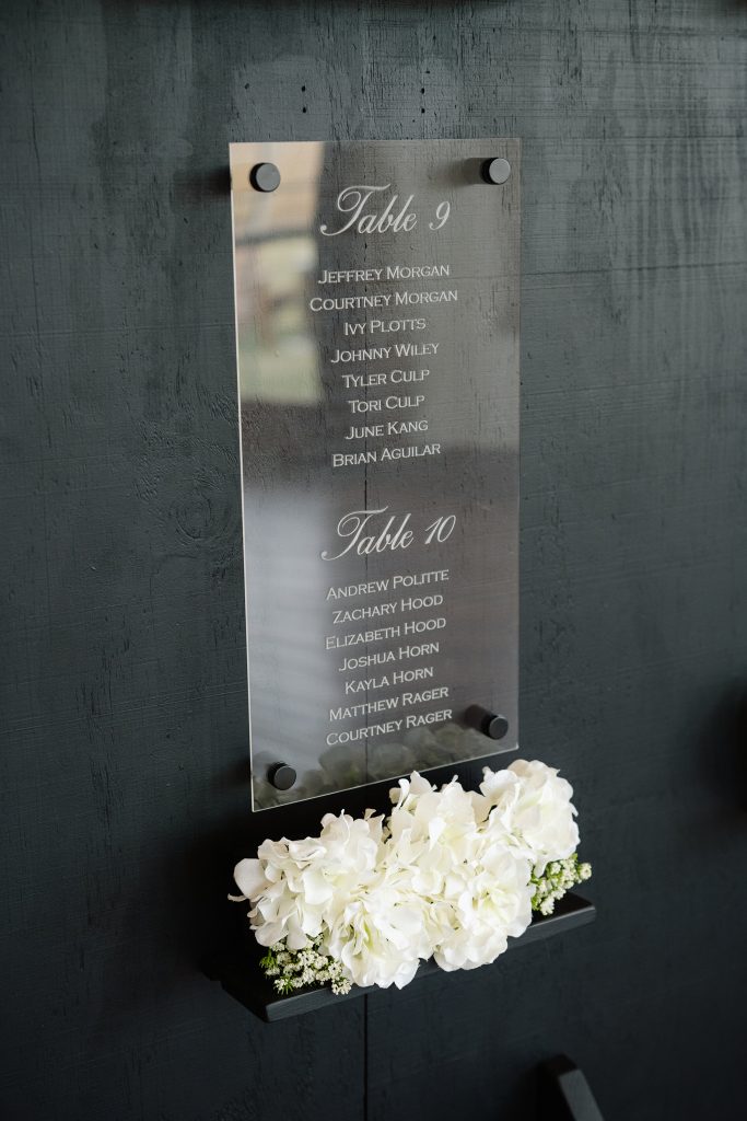 A black wall lined with clear panels, each mounted cleanly with names etched in white. White florals set beneath each panel, creating balance and a distinct visual moment.