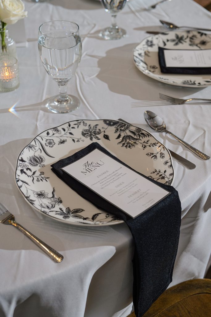 White linens and black accents. Patterned plates that soften the look and add a touch of romance to this modern wedding design.